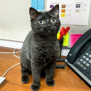 HOW TO ADOPT: This kitten is available for adoption by appointment. To schedule a time to meet this kitten, please contact Cindy at cgerke@arl-iowa.org. — – Loves to play, and his favorite toy is his ball tower with levels where he can bat toy balls around – Likes to climb and enjoyed climbing the multiple cat trees and mounted cat wall shelves in his foster home; will love some vertical space like cat trees in his new home! – Has done well with kids – Has done well with cats after a slow introduction – Needs a home with no dogs – Has an unusual black coat with silver undertones – Sweet, fun guy who will be a wonderful friend for a lucky person! – Arrived at the ARL after suffering major trauma; has recovered in our care but his trauma has left him with pupils that occasionally dilate differently. This does not appear to affect his ability to see or his quality of life (more info at ARL) |