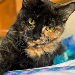– Has a lot of love to give and will be a wonderful companion for a quiet person or two who will allow her to settle in at her own slow pace. Once you’ve earned her trust, you’re in for a lifetime of loud purrs and playful antics.