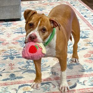 – Took a few days of settling into his foster home before he became interested in toys, and now he loves any and all toys; especially enjoys playing tug