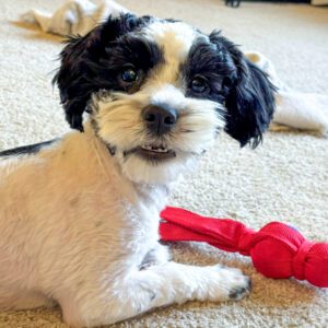 – Will seek pets and affection from those she trusts, and if her foster family is on the floor, she’ll sit next to them or on their lap while she chews on a toy