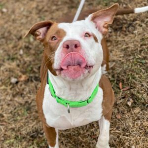 – Tends to be socially awkward with other dogs when she first meets them, but has gotten along great with other dogs in her foster home once getting to know each other; may do best with a dog friend who doesn’t mind if she’s a little pushy at first (dog intro recommended)