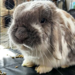 HOW TO ADOPT: This rabbit is available for adoption by appointment. To schedule a time to meet him, please email meetme@arl-iowa.org. — Beaker and Bunsen are Bonded Buddies; they’ll be adopted as a pair – Smaller and more reserved than his buddy; he is always just a couple steps behind when they go exploring and is often content to just head to his hideaway to snooze and relax – Prefers interaction and pets on his terms; prefers to be petted on the ground as opposed to being held at this time – Has met dogs and cats through the pen at his foster home, and has shown some interest, approaching them for sniffs – Did well for a basic groom and nail trim while in shelter – Would benefit from continued litter box training; prefers paper litter to pellet litter in the foster home and has had almost no accidents since switching – Loves food and has the most adorable pellet-crunching noises – Has been getting fresh veggies for snacks in the foster home, he prefers celery! |