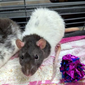 – A sweet, shy girl who is still learning that the world isn’t so scary – Can be startled by sudden movements and will do best in a calm home with an experienced rat owner – Despite being timid, can be curious – Enjoys eating yogurt and dog treats – Will blossom into a great companion with time and gentle handling – May do best in a home with other rats |