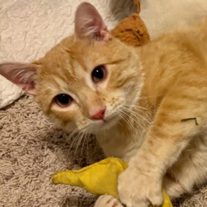 HOW TO ADOPT: This cat is participating in our Shelter Cat Getaway foster program, which gives cats a vacation from the shelter and lets them enjoy home life while they wait to be adopted. To schedule a time to meet this cat, please contact Mary at mmccarroll@arl-iowa.org — – Adorable, all orange guy who is friendly, curious, playful, and just a little bit goofy! – High energy fella who loves playtime, especially climbing tall cat trees and chasing catnip toys – Welcomes lots of attention: pets, scritches, brushing, kisses, being held, chatting, any playtime – Can become overstimulated and give play bites but gives clear consistent signals beforehand – easily redirected to focus on his stuffed animal instead – Looking for a cat savvy adopter willing to work with him on playing with toys and not fingers and hands All adoptable cats and kittens are spayed/neutered, microchipped and up to date on vaccinations (rabies and FVRCP as appropriate for their age) |