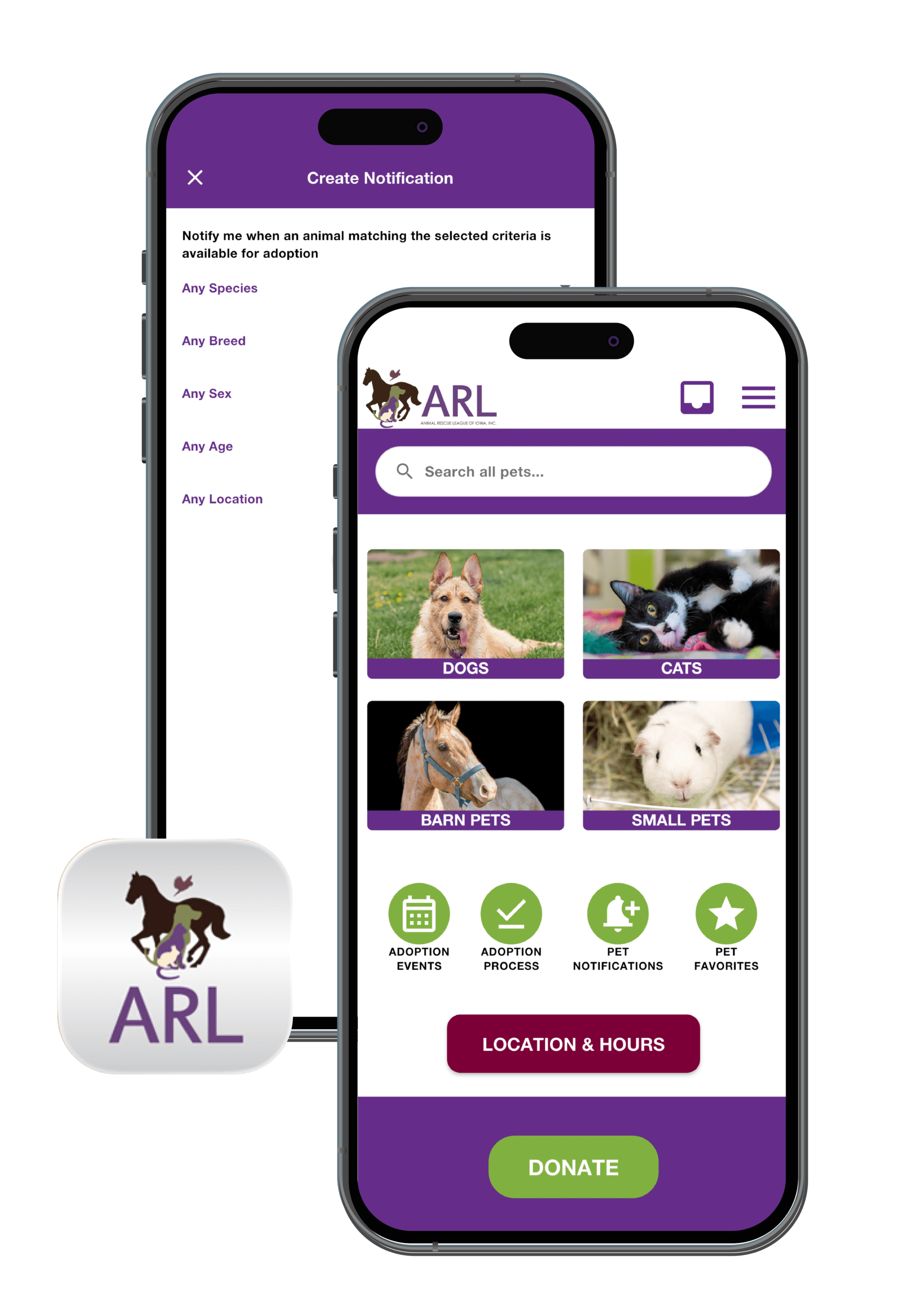 Download the ARL's app to receive notifications when a pet comes available that fits your criteria! You will also find the ARL's hours and locations, upcoming events, and more!