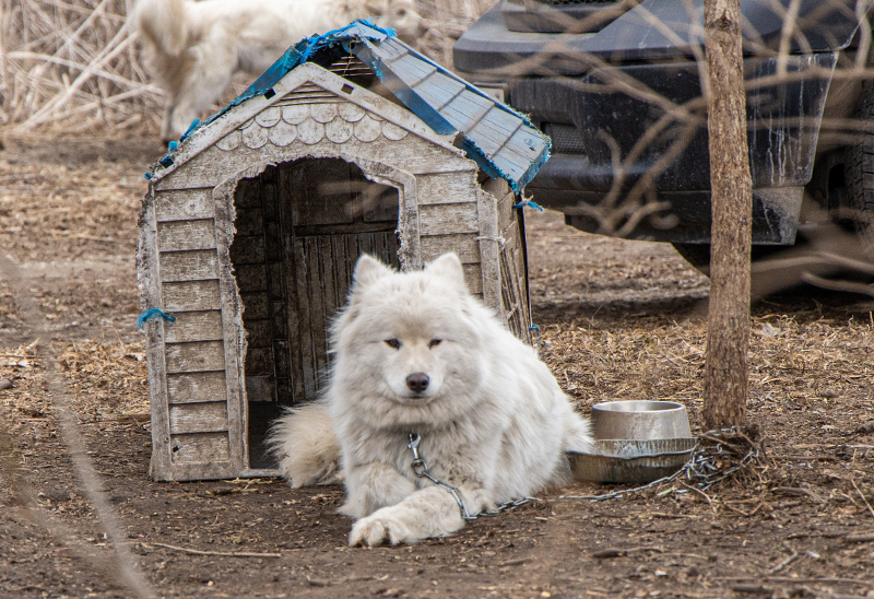 We arrived to find dogs chained to trees or trapped in makeshift pens. Many of the dogs were thin under their dirty, matted fur, and some of the trees had deep grooves under the chains from the dogs circling them over and over, desperate to be freed. Some dogs had no access to shelter because of the length of their chains, and others had little to protect them from the elements. One extremely matted dog was also blind. It was a heartbreaking scene.
