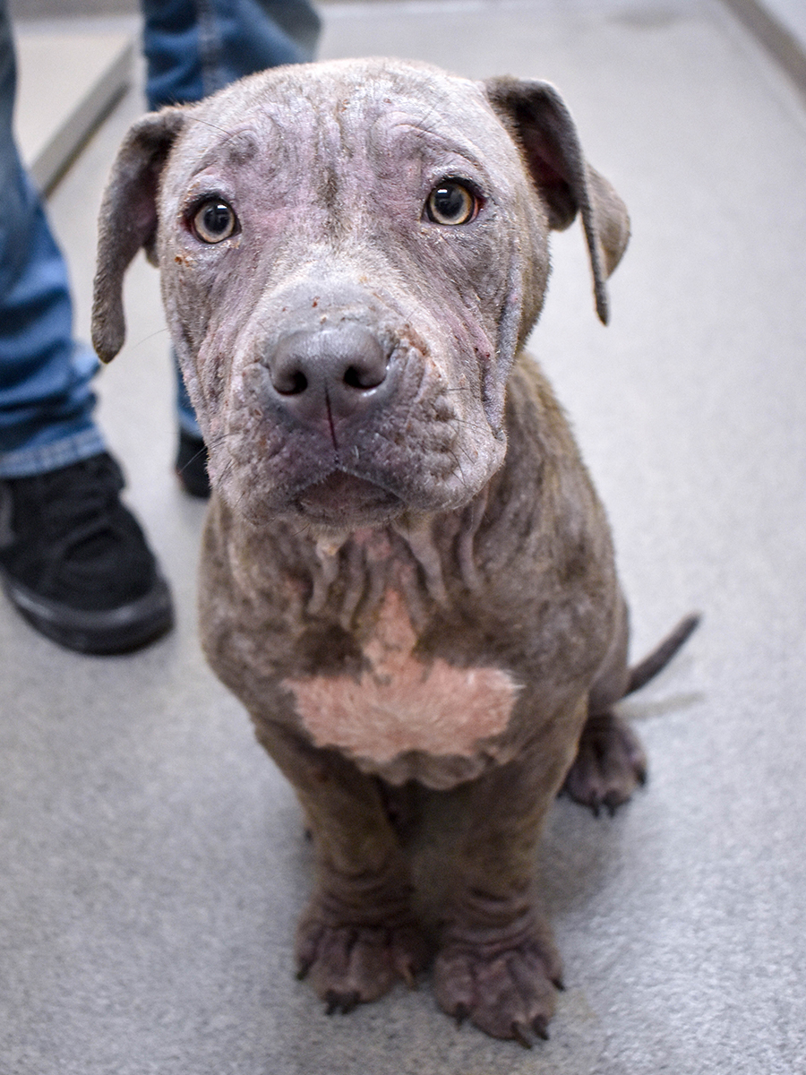 When Blueberry arrived at the Animal Rescue League, her body was hot to the touch and covered with scabs and sores, her fur was thin and patchy, her eyes were red and infected, and her feet were oversized from swelling. Our Emergency Care Team evaluated Blueberry immediately. We wrapped her up in a towel, carried her to our grooming room and gave her what was probably the first bath of her life. Live fleas, dead skin and scabs fell off in our hands as we gently rinsed away months of grime. Medicated shampoo cooled her burning skin.