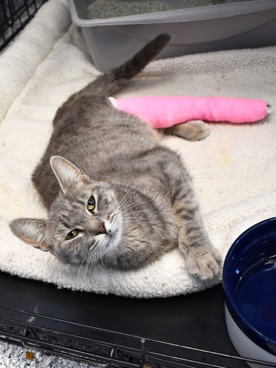 When Gracie was brought to the Animal Rescue League, she was just 6 pounds, she was very quiet and in severe pain. She had abrasions on her stomach and an obviously broken leg. She weakly tried to stand but her injuries were too severe. She was given pain medications immediately, and X-rays taken by our Emergency Care Team revealed even more serious injuries — she was not only suffering from a broken leg, but a broken pelvis, too. She needed surgery to save her life.