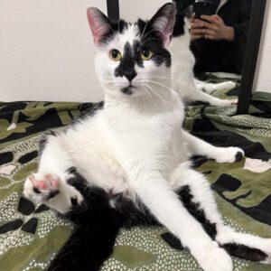 – Can be nervous at first, but warms up over time and is a cuddly, loving lap cat once he’s comfortable; looking for patient people who will give him the time he needs to come out of his shell